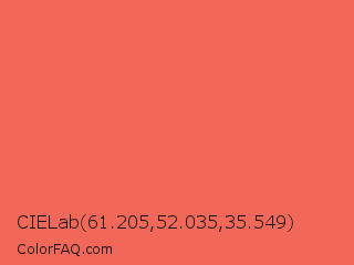 CIELab 61.205,52.035,35.549 Color is a light red color and the nearest color is Persimmon #ff6b53. Hex code #f26858 and RGB value is rgb(242,104,88). In RGB color space, this color is composed of 95% red, 41% green, 35% blue, In CMYK color space, this color is composed of 0% cyan, 57% magenta, 64% yellow , 5% black , In HSL color space, this color has a hue angle of 6° , 86% saturation and 65% lightness.
