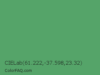 CIELab 61.222,-37.598,23.32 Color is a normal green color and the nearest color is Fruit Salad #4f9d5d. Hex code #55a469 and RGB value is rgb(85,164,105). In RGB color space, this color is composed of 33% red, 64% green, 41% blue, In CMYK color space, this color is composed of 48% cyan, 0% magenta, 36% yellow , 36% black , In HSL color space, this color has a hue angle of 135° , 32% saturation and 49% lightness.