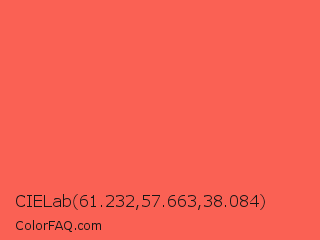 CIELab 61.232,57.663,38.084 Color is a light red color and the nearest color is Sunset Orange #fd5e53. Hex code #fa6154 and RGB value is rgb(250,97,84). In RGB color space, this color is composed of 98% red, 38% green, 33% blue, In CMYK color space, this color is composed of 0% cyan, 61% magenta, 66% yellow , 2% black , In HSL color space, this color has a hue angle of 5° , 94% saturation and 65% lightness.