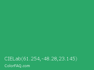 CIELab 61.254,-48.28,23.145 Color is a normal green color and the nearest color is Green Crayola #1cac78. Hex code #2ba869 and RGB value is rgb(43,168,105). In RGB color space, this color is composed of 17% red, 66% green, 41% blue, In CMYK color space, this color is composed of 74% cyan, 0% magenta, 38% yellow , 34% black , In HSL color space, this color has a hue angle of 150° , 59% saturation and 41% lightness.