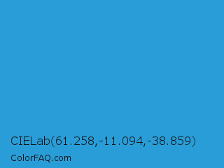 CIELab 61.258,-11.094,-38.859 Color is a normal blue color and the nearest color is Curious Blue #2596d1. Hex code #299dd8 and RGB value is rgb(41,157,216). In RGB color space, this color is composed of 16% red, 62% green, 85% blue, In CMYK color space, this color is composed of 81% cyan, 27% magenta, 0% yellow , 15% black , In HSL color space, this color has a hue angle of 200° , 69% saturation and 50% lightness.