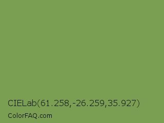CIELab 61.258,-26.259,35.927 Color is a normal green color and the nearest color is Asparagus Green #7ba05b. Hex code #7a9f52 and RGB value is rgb(122,159,82). In RGB color space, this color is composed of 48% red, 62% green, 32% blue, In CMYK color space, this color is composed of 23% cyan, 0% magenta, 48% yellow , 38% black , In HSL color space, this color has a hue angle of 89° , 32% saturation and 47% lightness.