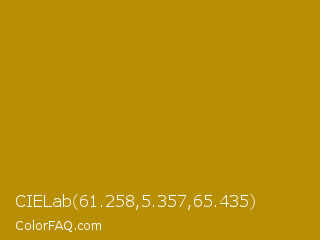 CIELab 61.258,5.357,65.435 Color is a normal yellow color and the nearest color is Dark Goldenrod #b8860b. Hex code #b88e03 and RGB value is rgb(184,142,3). In RGB color space, this color is composed of 72% red, 56% green, 1% blue, In CMYK color space, this color is composed of 0% cyan, 23% magenta, 98% yellow , 28% black , In HSL color space, this color has a hue angle of 46° , 97% saturation and 37% lightness.