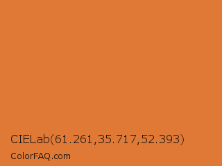 CIELab 61.261,35.717,52.393 Color is a normal orange color and the nearest color is Red Damask #da6a41. Hex code #e07836 and RGB value is rgb(224,120,54). In RGB color space, this color is composed of 88% red, 47% green, 21% blue, In CMYK color space, this color is composed of 0% cyan, 46% magenta, 76% yellow , 12% black , In HSL color space, this color has a hue angle of 23° , 73% saturation and 55% lightness.