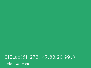 CIELab 61.273,-47.88,20.991 Color is a normal green color and the nearest color is Green Crayola #1cac78. Hex code #28a86d and RGB value is rgb(40,168,109). In RGB color space, this color is composed of 16% red, 66% green, 43% blue, In CMYK color space, this color is composed of 76% cyan, 0% magenta, 35% yellow , 34% black , In HSL color space, this color has a hue angle of 152° , 62% saturation and 41% lightness.