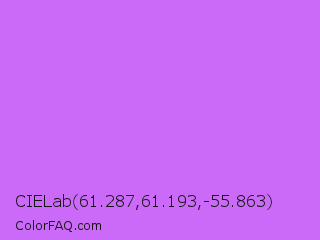 CIELab 61.287,61.193,-55.863 Color is a light purple color and the nearest color is Heliotrope #df73ff. Hex code #cb69f8 and RGB value is rgb(203,105,248). In RGB color space, this color is composed of 80% red, 41% green, 97% blue, In CMYK color space, this color is composed of 18% cyan, 58% magenta, 0% yellow , 3% black , In HSL color space, this color has a hue angle of 281° , 91% saturation and 69% lightness.