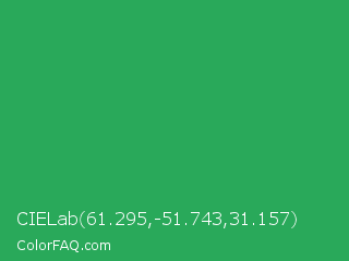 CIELab 61.295,-51.743,31.157 Color is a normal green color and the nearest color is Chateau Green #40a860. Hex code #29a95a and RGB value is rgb(41,169,90). In RGB color space, this color is composed of 16% red, 66% green, 35% blue, In CMYK color space, this color is composed of 76% cyan, 0% magenta, 47% yellow , 34% black , In HSL color space, this color has a hue angle of 143° , 61% saturation and 41% lightness.