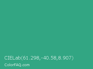 CIELab 61.298,-40.58,8.907 Color is a normal green color and the nearest color is Jungle Green #29ab87. Hex code #32a683 and RGB value is rgb(50,166,131). In RGB color space, this color is composed of 20% red, 65% green, 51% blue, In CMYK color space, this color is composed of 70% cyan, 0% magenta, 21% yellow , 35% black , In HSL color space, this color has a hue angle of 162° , 54% saturation and 42% lightness.