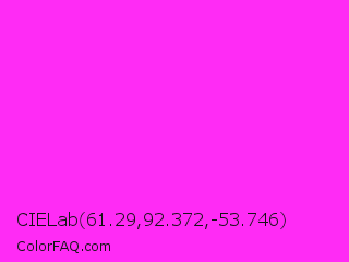 CIELab 61.29,92.372,-53.746 Color is a normal magenta color and the nearest color is Hot Magenta #ff1dce. Hex code #ff2bf5 and RGB value is rgb(255,43,245). In RGB color space, this color is composed of 100% red, 17% green, 96% blue, In CMYK color space, this color is composed of 0% cyan, 83% magenta, 4% yellow , 0% black , In HSL color space, this color has a hue angle of 303° , 100% saturation and 58% lightness.