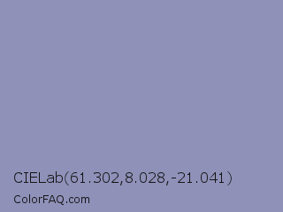 CIELab 61.302,8.028,-21.041 Color is a light blue color and the nearest color is Cool Grey #8c92ac. Hex code #8f91b9 and RGB value is rgb(143,145,185). In RGB color space, this color is composed of 56% red, 57% green, 73% blue, In CMYK color space, this color is composed of 23% cyan, 22% magenta, 0% yellow , 27% black , In HSL color space, this color has a hue angle of 237° , 23% saturation and 64% lightness.