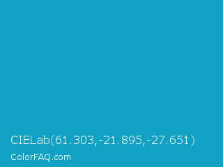 CIELab 61.303,-21.895,-27.651 Color is a normal cyan color and the nearest color is Blue Green #0d98ba. Hex code #11a1c4 and RGB value is rgb(17,161,196). In RGB color space, this color is composed of 7% red, 63% green, 77% blue, In CMYK color space, this color is composed of 91% cyan, 18% magenta, 0% yellow , 23% black , In HSL color space, this color has a hue angle of 192° , 84% saturation and 42% lightness.