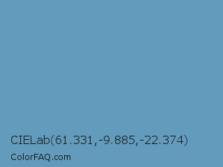 CIELab 61.331,-9.885,-22.374 Color is a normal blue color and the nearest color is Cerulean Frost #6d9bc3. Hex code #629bbb and RGB value is rgb(98,155,187). In RGB color space, this color is composed of 38% red, 61% green, 73% blue, In CMYK color space, this color is composed of 48% cyan, 17% magenta, 0% yellow , 27% black , In HSL color space, this color has a hue angle of 202° , 40% saturation and 56% lightness.