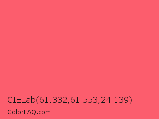 CIELab 61.332,61.553,24.139 Color is a light red color and the nearest color is Fiery Rose #ff5470. Hex code #fc5d6d and RGB value is rgb(252,93,109). In RGB color space, this color is composed of 99% red, 36% green, 43% blue, In CMYK color space, this color is composed of 0% cyan, 63% magenta, 57% yellow , 1% black , In HSL color space, this color has a hue angle of 354° , 96% saturation and 68% lightness.