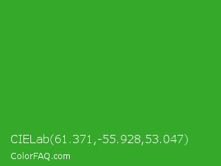 CIELab 61.371,-55.928,53.047 Color is a normal green color and the nearest color is Wageningen Green #34b233. Hex code #35aa2a and RGB value is rgb(53,170,42). In RGB color space, this color is composed of 21% red, 67% green, 16% blue, In CMYK color space, this color is composed of 69% cyan, 0% magenta, 75% yellow , 33% black , In HSL color space, this color has a hue angle of 115° , 60% saturation and 42% lightness.