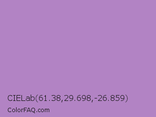 CIELab 61.38,29.698,-26.859 Color is a light purple color and the nearest color is African Violet #b284be. Hex code #b283c4 and RGB value is rgb(178,131,196). In RGB color space, this color is composed of 70% red, 51% green, 77% blue, In CMYK color space, this color is composed of 9% cyan, 33% magenta, 0% yellow , 23% black , In HSL color space, this color has a hue angle of 283° , 36% saturation and 64% lightness.