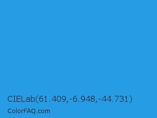 CIELab 61.409,-6.948,-44.731 Color is a normal blue color and the nearest color is Button Blue #24a0ed. Hex code #259ce3 and RGB value is rgb(37,156,227). In RGB color space, this color is composed of 15% red, 61% green, 89% blue, In CMYK color space, this color is composed of 84% cyan, 31% magenta, 0% yellow , 11% black , In HSL color space, this color has a hue angle of 202° , 77% saturation and 52% lightness.