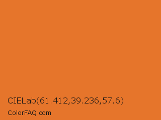 CIELab 61.412,39.236,57.6 Color is a normal orange color and the nearest color is Vivid Tangelo #f07427. Hex code #e6752b and RGB value is rgb(230,117,43). In RGB color space, this color is composed of 90% red, 46% green, 17% blue, In CMYK color space, this color is composed of 0% cyan, 49% magenta, 81% yellow , 10% black , In HSL color space, this color has a hue angle of 24° , 79% saturation and 54% lightness.