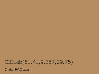 CIELab 61.41,9.367,29.75 Color is a normal orange color and the nearest color is Muddy Waters #b78e5c. Hex code #b58d60 and RGB value is rgb(181,141,96). In RGB color space, this color is composed of 71% red, 55% green, 38% blue, In CMYK color space, this color is composed of 0% cyan, 22% magenta, 47% yellow , 29% black , In HSL color space, this color has a hue angle of 32° , 36% saturation and 54% lightness.