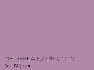 CIELab 61.428,22.312,-10.9 Color is a light magenta color and the nearest color is Opera Mauve #b784a7. Hex code #b387a8 and RGB value is rgb(179,135,168). In RGB color space, this color is composed of 70% red, 53% green, 66% blue, In CMYK color space, this color is composed of 0% cyan, 25% magenta, 6% yellow , 30% black , In HSL color space, this color has a hue angle of 315° , 22% saturation and 62% lightness.