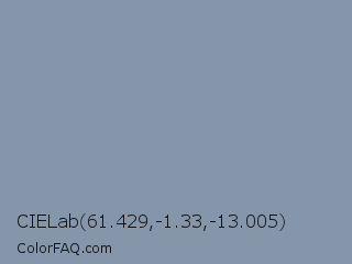 CIELab 61.429,-1.33,-13.005 Color is a normal blue color and the nearest color is Cool Grey #8c92ac. Hex code #8596ab and RGB value is rgb(133,150,171). In RGB color space, this color is composed of 52% red, 59% green, 67% blue, In CMYK color space, this color is composed of 22% cyan, 12% magenta, 0% yellow , 33% black , In HSL color space, this color has a hue angle of 213° , 18% saturation and 60% lightness.