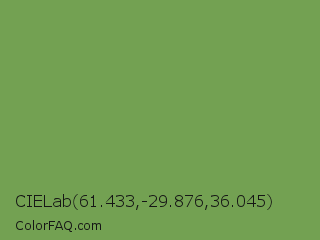CIELab 61.433,-29.876,36.045 Color is a normal green color and the nearest color is Asparagus Green #7ba05b. Hex code #73a152 and RGB value is rgb(115,161,82). In RGB color space, this color is composed of 45% red, 63% green, 32% blue, In CMYK color space, this color is composed of 29% cyan, 0% magenta, 49% yellow , 37% black , In HSL color space, this color has a hue angle of 95° , 33% saturation and 48% lightness.