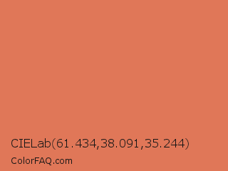 CIELab 61.434,38.091,35.244 Color is a light red color and the nearest color is Terracotta #e2725b. Hex code #e07758 and RGB value is rgb(224,119,88). In RGB color space, this color is composed of 88% red, 47% green, 35% blue, In CMYK color space, this color is composed of 0% cyan, 47% magenta, 61% yellow , 12% black , In HSL color space, this color has a hue angle of 14° , 69% saturation and 61% lightness.