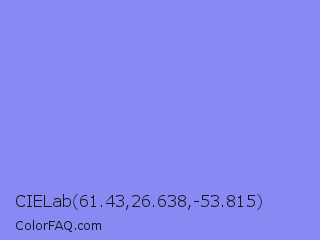 CIELab 61.43,26.638,-53.815 Color is a light blue color and the nearest color is Portage #8b9fee. Hex code #8989f4 and RGB value is rgb(137,137,244). In RGB color space, this color is composed of 54% red, 54% green, 96% blue, In CMYK color space, this color is composed of 44% cyan, 44% magenta, 0% yellow , 4% black , In HSL color space, this color has a hue angle of 240° , 83% saturation and 75% lightness.