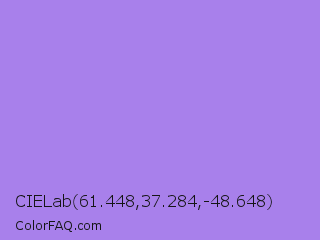 CIELab 61.448,37.284,-48.648 Color is a light violet color and the nearest color is Lavender #b57edc. Hex code #a880eb and RGB value is rgb(168,128,235). In RGB color space, this color is composed of 66% red, 50% green, 92% blue, In CMYK color space, this color is composed of 29% cyan, 46% magenta, 0% yellow , 8% black , In HSL color space, this color has a hue angle of 262° , 73% saturation and 71% lightness.