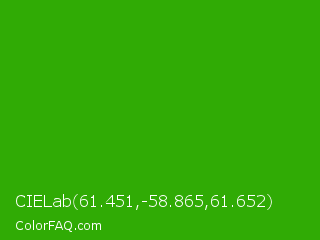 CIELab 61.451,-58.865,61.652 Color is a normal green color and the nearest color is Slimy Green #299617. Hex code #30ab05 and RGB value is rgb(48,171,5). In RGB color space, this color is composed of 19% red, 67% green, 2% blue, In CMYK color space, this color is composed of 72% cyan, 0% magenta, 97% yellow , 33% black , In HSL color space, this color has a hue angle of 104° , 94% saturation and 35% lightness.
