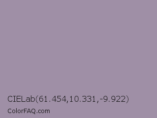 CIELab 61.454,10.331,-9.922 Color is a light purple color and the nearest color is Manatee #979aaa. Hex code #9f8fa6 and RGB value is rgb(159,143,166). In RGB color space, this color is composed of 62% red, 56% green, 65% blue, In CMYK color space, this color is composed of 4% cyan, 14% magenta, 0% yellow , 35% black , In HSL color space, this color has a hue angle of 282° , 11% saturation and 61% lightness.