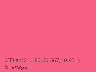 CIELab 61.486,60.567,10.931 Color is a light red color and the nearest color is Brink Pink #fb607f. Hex code #f76084 and RGB value is rgb(247,96,132). In RGB color space, this color is composed of 97% red, 38% green, 52% blue, In CMYK color space, this color is composed of 0% cyan, 61% magenta, 47% yellow , 3% black , In HSL color space, this color has a hue angle of 346° , 90% saturation and 67% lightness.