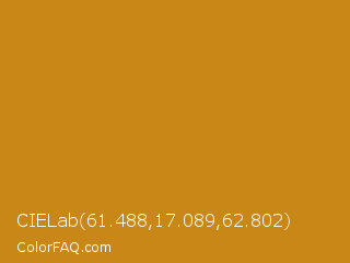 CIELab 61.488,17.089,62.802 Color is a normal orange color and the nearest color is Geebung #d18f1b. Hex code #c98717 and RGB value is rgb(201,135,23). In RGB color space, this color is composed of 79% red, 53% green, 9% blue, In CMYK color space, this color is composed of 0% cyan, 33% magenta, 89% yellow , 21% black , In HSL color space, this color has a hue angle of 38° , 79% saturation and 44% lightness.