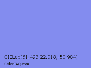 CIELab 61.493,22.018,-50.984 Color is a light blue color and the nearest color is Portage #8b9fee. Hex code #838cef and RGB value is rgb(131,140,239). In RGB color space, this color is composed of 51% red, 55% green, 94% blue, In CMYK color space, this color is composed of 45% cyan, 41% magenta, 0% yellow , 6% black , In HSL color space, this color has a hue angle of 235° , 77% saturation and 73% lightness.