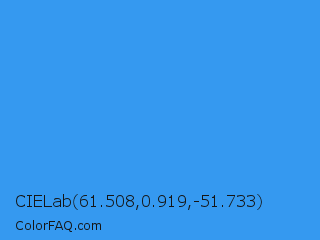 CIELab 61.508,0.919,-51.733 Color is a normal blue color and the nearest color is Brilliant Azure #3399ff. Hex code #3599f0 and RGB value is rgb(53,153,240). In RGB color space, this color is composed of 21% red, 60% green, 94% blue, In CMYK color space, this color is composed of 78% cyan, 36% magenta, 0% yellow , 6% black , In HSL color space, this color has a hue angle of 208° , 86% saturation and 57% lightness.