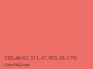 CIELab 61.511,47.905,26.179 Color is a light red color and the nearest color is Light Carmine Pink #e66771. Hex code #eb6e69 and RGB value is rgb(235,110,105). In RGB color space, this color is composed of 92% red, 43% green, 41% blue, In CMYK color space, this color is composed of 0% cyan, 53% magenta, 55% yellow , 8% black , In HSL color space, this color has a hue angle of 2° , 76% saturation and 67% lightness.