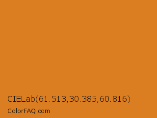 CIELab 61.513,30.385,60.816 Color is a normal orange color and the nearest color is Zest #e5841b. Hex code #db7d21 and RGB value is rgb(219,125,33). In RGB color space, this color is composed of 86% red, 49% green, 13% blue, In CMYK color space, this color is composed of 0% cyan, 43% magenta, 85% yellow , 14% black , In HSL color space, this color has a hue angle of 30° , 74% saturation and 49% lightness.