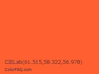 CIELab 61.515,58.322,56.978 Color is a normal red color and the nearest color is Outrageous Orange Crayola #ff6037. Hex code #ff6030 and RGB value is rgb(255,96,48). In RGB color space, this color is composed of 100% red, 38% green, 19% blue, In CMYK color space, this color is composed of 0% cyan, 62% magenta, 81% yellow , 0% black , In HSL color space, this color has a hue angle of 14° , 100% saturation and 59% lightness.