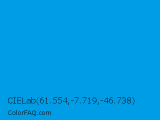 CIELab 61.554,-7.719,-46.738 Color is a normal blue color and the nearest color is Vivid Cerulean #00aaee. Hex code #009de7 and RGB value is rgb(0,157,231). In RGB color space, this color is composed of 0% red, 62% green, 91% blue, In CMYK color space, this color is composed of 100% cyan, 32% magenta, 0% yellow , 9% black , In HSL color space, this color has a hue angle of 199° , 100% saturation and 45% lightness.
