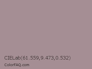 CIELab 61.559,9.473,0.532 Color is a light red color and the nearest color is Dusty Gray #a8989b. Hex code #a68f94 and RGB value is rgb(166,143,148). In RGB color space, this color is composed of 65% red, 56% green, 58% blue, In CMYK color space, this color is composed of 0% cyan, 14% magenta, 11% yellow , 35% black , In HSL color space, this color has a hue angle of 347° , 11% saturation and 61% lightness.