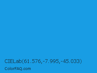 CIELab 61.576,-7.995,-45.033 Color is a normal blue color and the nearest color is Button Blue #24a0ed. Hex code #189de4 and RGB value is rgb(24,157,228). In RGB color space, this color is composed of 9% red, 62% green, 89% blue, In CMYK color space, this color is composed of 89% cyan, 31% magenta, 0% yellow , 11% black , In HSL color space, this color has a hue angle of 201° , 81% saturation and 49% lightness.