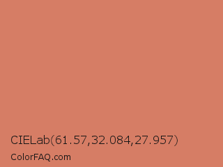 CIELab 61.57,32.084,27.957 Color is a light red color and the nearest color is Japonica #d87c63. Hex code #d67d65 and RGB value is rgb(214,125,101). In RGB color space, this color is composed of 84% red, 49% green, 40% blue, In CMYK color space, this color is composed of 0% cyan, 42% magenta, 53% yellow , 16% black , In HSL color space, this color has a hue angle of 13° , 58% saturation and 62% lightness.