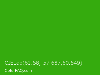 CIELab 61.58,-57.687,60.549 Color is a normal green color and the nearest color is Slimy Green #299617. Hex code #35ab0e and RGB value is rgb(53,171,14). In RGB color space, this color is composed of 21% red, 67% green, 5% blue, In CMYK color space, this color is composed of 69% cyan, 0% magenta, 92% yellow , 33% black , In HSL color space, this color has a hue angle of 105° , 85% saturation and 36% lightness.