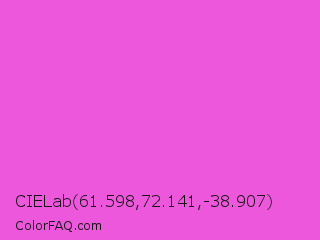 CIELab 61.598,72.141,-38.907 Color is a light magenta color and the nearest color is Purple Pizzazz #fe4eda. Hex code #ed57db and RGB value is rgb(237,87,219). In RGB color space, this color is composed of 93% red, 34% green, 86% blue, In CMYK color space, this color is composed of 0% cyan, 63% magenta, 8% yellow , 7% black , In HSL color space, this color has a hue angle of 307° , 81% saturation and 64% lightness.