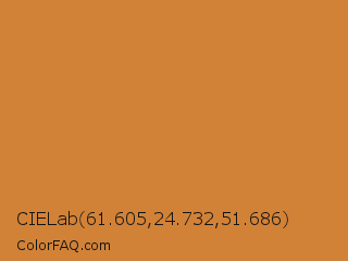 CIELab 61.605,24.732,51.686 Color is a normal orange color and the nearest color is Bronze #cd7f32. Hex code #d28237 and RGB value is rgb(210,130,55). In RGB color space, this color is composed of 82% red, 51% green, 22% blue, In CMYK color space, this color is composed of 0% cyan, 38% magenta, 74% yellow , 18% black , In HSL color space, this color has a hue angle of 29° , 63% saturation and 52% lightness.