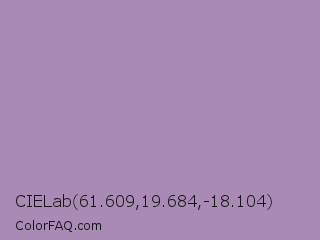 CIELab 61.609,19.684,-18.104 Color is a light purple color and the nearest color is Glossy Grape #ab92b3. Hex code #a98ab5 and RGB value is rgb(169,138,181). In RGB color space, this color is composed of 66% red, 54% green, 71% blue, In CMYK color space, this color is composed of 7% cyan, 24% magenta, 0% yellow , 29% black , In HSL color space, this color has a hue angle of 283° , 23% saturation and 63% lightness.