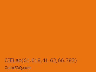CIELab 61.618,41.62,66.783 Color is a normal orange color and the nearest color is Christine #e7730a. Hex code #eb730f and RGB value is rgb(235,115,15). In RGB color space, this color is composed of 92% red, 45% green, 6% blue, In CMYK color space, this color is composed of 0% cyan, 51% magenta, 94% yellow , 8% black , In HSL color space, this color has a hue angle of 27° , 88% saturation and 49% lightness.