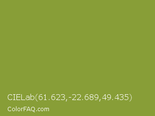 CIELab 61.623,-22.689,49.435 Color is a normal lime color and the nearest color is Sushi #87ab39. Hex code #889e37 and RGB value is rgb(136,158,55). In RGB color space, this color is composed of 53% red, 62% green, 22% blue, In CMYK color space, this color is composed of 14% cyan, 0% magenta, 65% yellow , 38% black , In HSL color space, this color has a hue angle of 73° , 48% saturation and 42% lightness.
