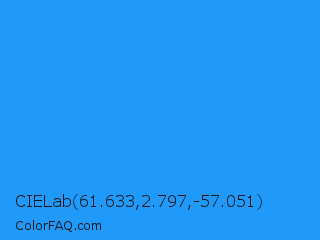 CIELab 61.633,2.797,-57.051 Color is a normal blue color and the nearest color is Dodger Blue #1e90ff. Hex code #1f99fa and RGB value is rgb(31,153,250). In RGB color space, this color is composed of 12% red, 60% green, 98% blue, In CMYK color space, this color is composed of 88% cyan, 39% magenta, 0% yellow , 2% black , In HSL color space, this color has a hue angle of 207° , 96% saturation and 55% lightness.