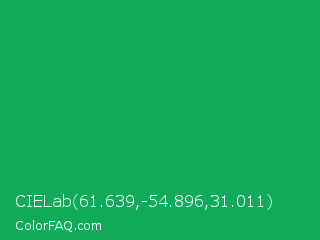 CIELab 61.639,-54.896,31.011 Color is a normal green color and the nearest color is GO Green #00ab66. Hex code #0fab5b and RGB value is rgb(15,171,91). In RGB color space, this color is composed of 6% red, 67% green, 36% blue, In CMYK color space, this color is composed of 91% cyan, 0% magenta, 47% yellow , 33% black , In HSL color space, this color has a hue angle of 149° , 84% saturation and 36% lightness.