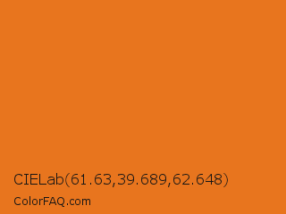 CIELab 61.63,39.689,62.648 Color is a normal orange color and the nearest color is Tango #ed7a1c. Hex code #e8751e and RGB value is rgb(232,117,30). In RGB color space, this color is composed of 91% red, 46% green, 12% blue, In CMYK color space, this color is composed of 0% cyan, 50% magenta, 87% yellow , 9% black , In HSL color space, this color has a hue angle of 26° , 81% saturation and 51% lightness.